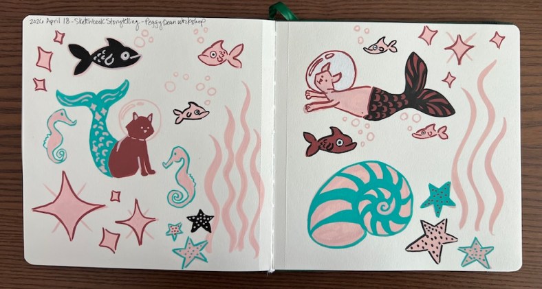 On Saturday, I attended a live online workshop… it was a fun and playful class. We drew in our sketchbooks and used acrylic markers. The theme was Purrcats In Space 🤣